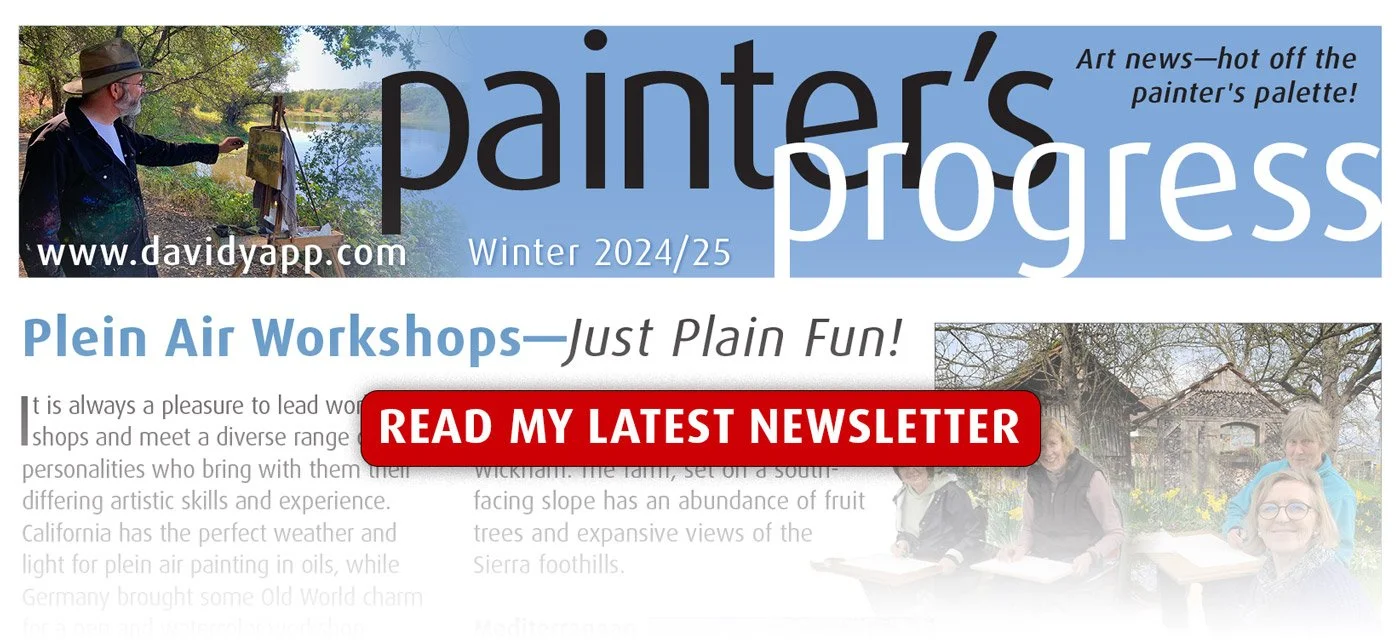 Plein air landscape artist David Yapp paints scenes of California in oils. Subjects are as diverse as the California landscape itself and include the Sierra Nevada mountains, the oak covered hills and scenic coastline. David uses palette knife and brushes in a style that is reminiscent of impressionism.